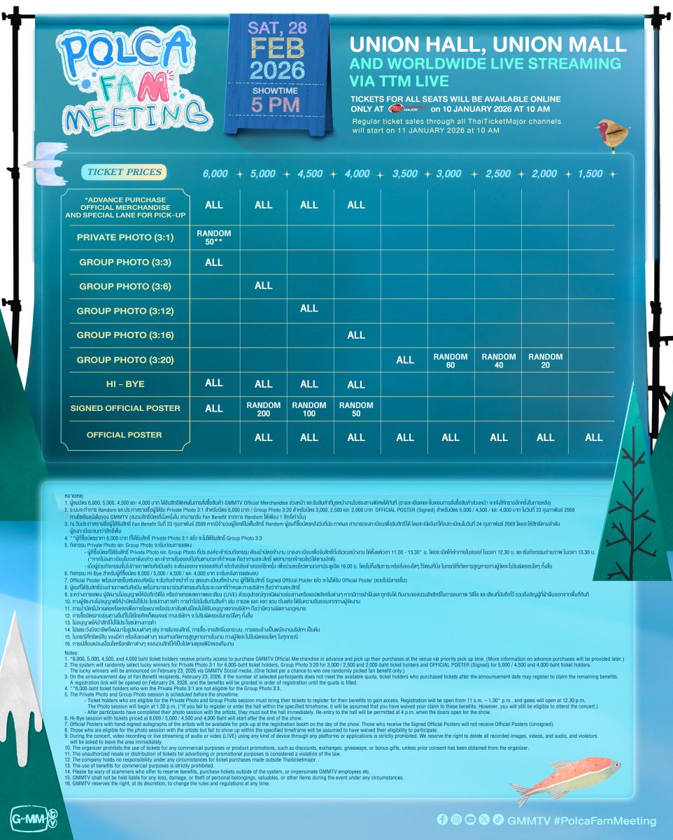 สำหรับผู้สนใจสามารถจับจองบัตรงาน “POLCA FAM MEETING” บนช่องทางออนไลน์ ในวันเสาร์ที่ 10 มกราคม 2569 เริ่มเวลา 10.00 น. เป็นต้นไป เปิดจำหน่ายทุกที่นั่ง ทางออนไลน์ที่ www.thaiticketmajor.com เท่านั้น และ เปิดจำหน่ายบัตร ทุกช่องทางตามปกติ ในวันอาทิตย์ที่ 11 มกราคม 2569 เริ่มเวลา 10.00 น. เป็นต้นไป ทางไทยทิคเก็ตเมเจอร์ทุกสาขา, www.thaiticketmajor.com และ Call center โทร 0-2262-3456 โดยบัตรราคา 6,000 / 5,000 / 4,500 / 4,000 /  3,500 / 3,000 / 2,500 / 2,000 / 1,500 บาท และดูสดผ่าน TTM LIVE บัตรราคา 1,500 / 1,200 บาท (ลิ้งค์และโค้ดรับชม) (กรณีต้องการรับบัตรพลาสติกที่ระลึก ชำระเพิ่ม 30/ใบ) หรือติดตามรายละเอียดเพิ่มเติมได้ที่ www.thaiticketmajor.com หรือ www.facebook.com/gmmtvofficial & Instagram & X & TikTok & YouTube & Weibo : GMMTV